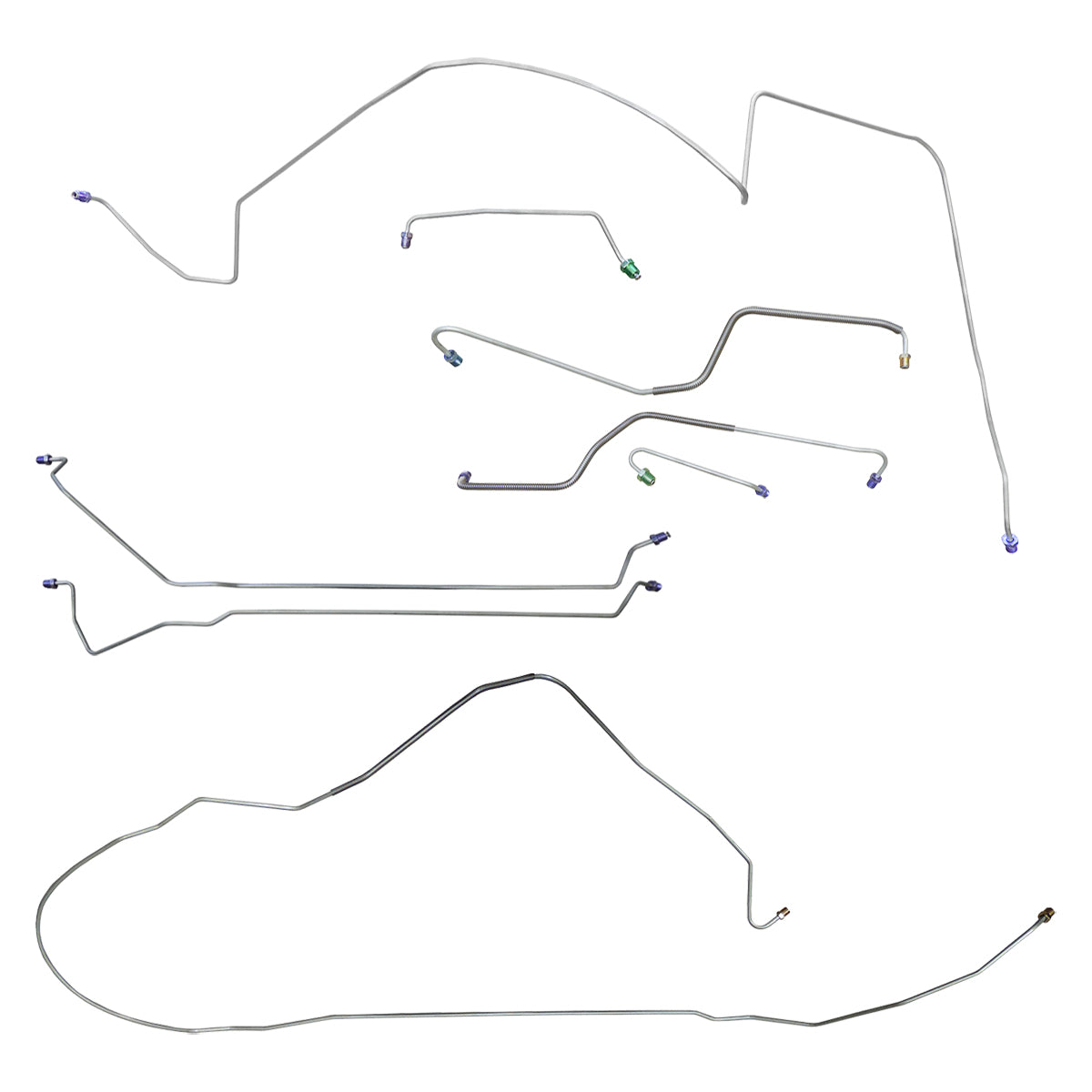 This preformed complete brake line kit will replace all the metal brake lines on your vehicle and includes the master cylinder lines, left front line and right-front crossover line, intermediate lines, and rear axle lines/trailing arm lines.