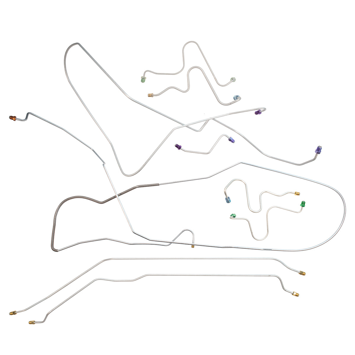 This preformed complete brake line kit will replace all the metal brake lines on your vehicle and includes the master cylinder lines, left front line and right-front crossover line, intermediate lines, and rear axle lines/trailing arm lines.