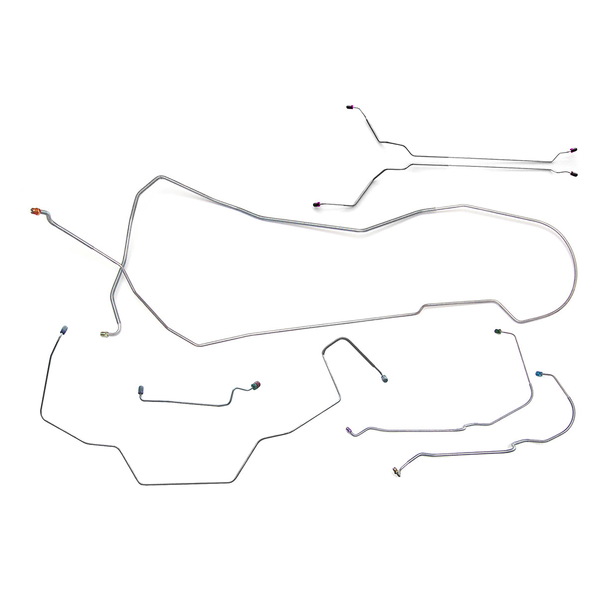 This preformed complete brake line kit will replace all the metal brake lines on your vehicle and includes the master cylinder lines, left front line and right-front crossover line, intermediate lines, and rear axle lines/trailing arm lines.