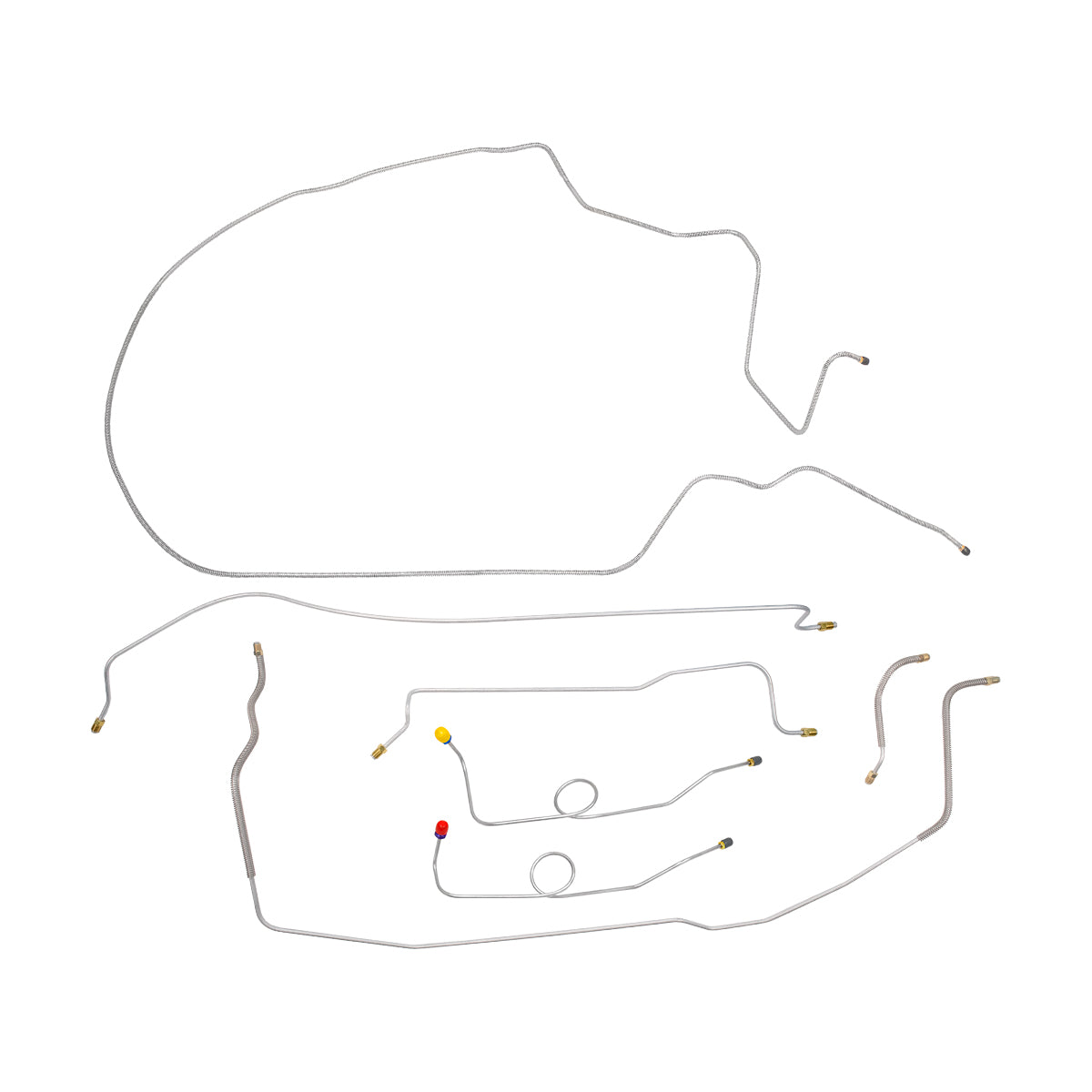 This preformed complete brake line kit will replace all the metal brake lines on your vehicle and includes the master cylinder lines, left front line and right-front crossover line, intermediate lines, and rear axle lines/trailing arm lines.